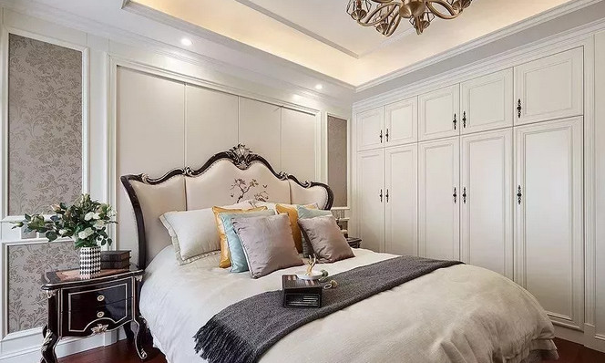 歐式美式風(fēng)格往往都比較奢華,因此搭配白色衣柜的話,一般都是選擇帶有雕花的衣柜門,而且柜門把手也是以金屬拉手為主,整體感覺(jué)比較奢華端莊。