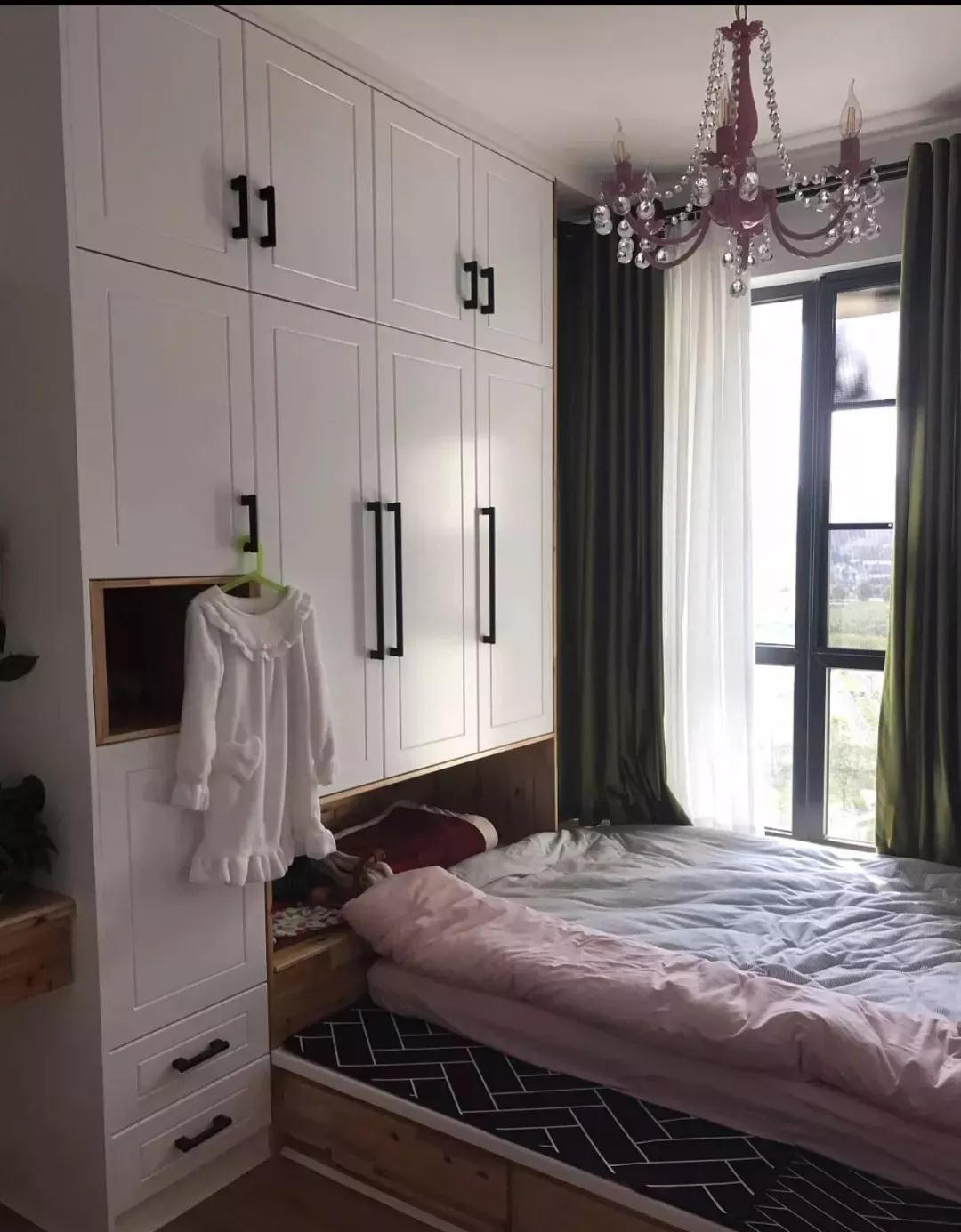 對(duì)于比較小的臥室而言,可能比較難以騰出擺放衣柜的位置,這個(gè)時(shí)候就可以把衣柜與床組合起來,在床頭或床尾位置裝個(gè)定制衣柜,這樣可以達(dá)到非常巧妙的空間利用效果。