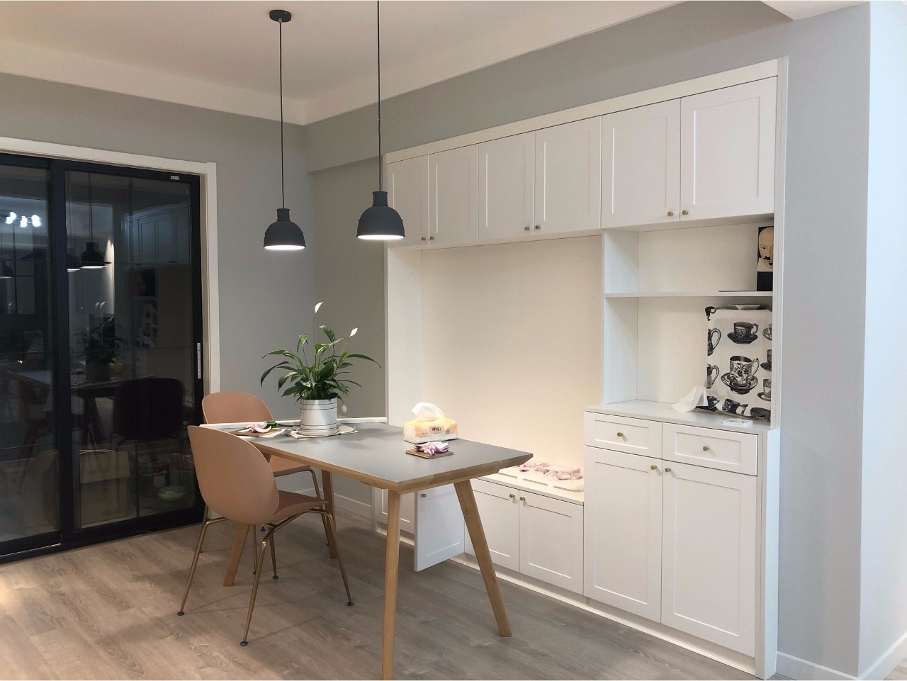 餐廳空間寬度比較緊湊,裝了餐邊柜就不方便擺放餐椅的話,就可以考慮做卡座式的餐邊柜了,通過在餐邊柜嵌入卡座,這樣可以為過道節(jié)省出40cm左右的通道距離,同時(shí)又能獲得實(shí)用的餐邊柜設(shè)計(jì)。