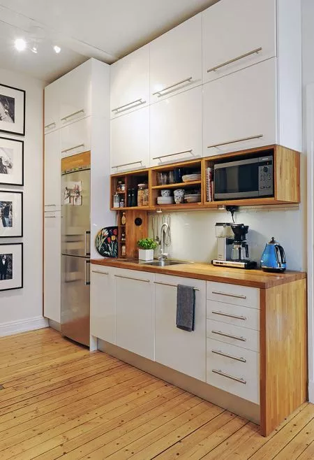 放到臺(tái)面?那就做不到“臺(tái)面無(wú)一物”的整潔了。所以,打算裝烤箱、微波爐的話(huà),櫥柜最好設(shè)計(jì)成有藏有露,外露的柜體可以放烤箱。