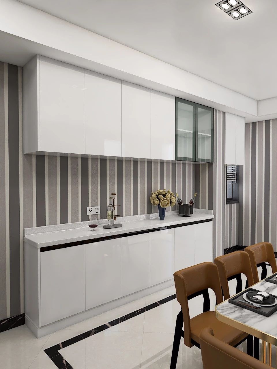 白色作為百搭的顏色,用作定制全鋁餐邊柜的柜體,并在中間加入一些其他顏色的格架,會顯得更有層次感。