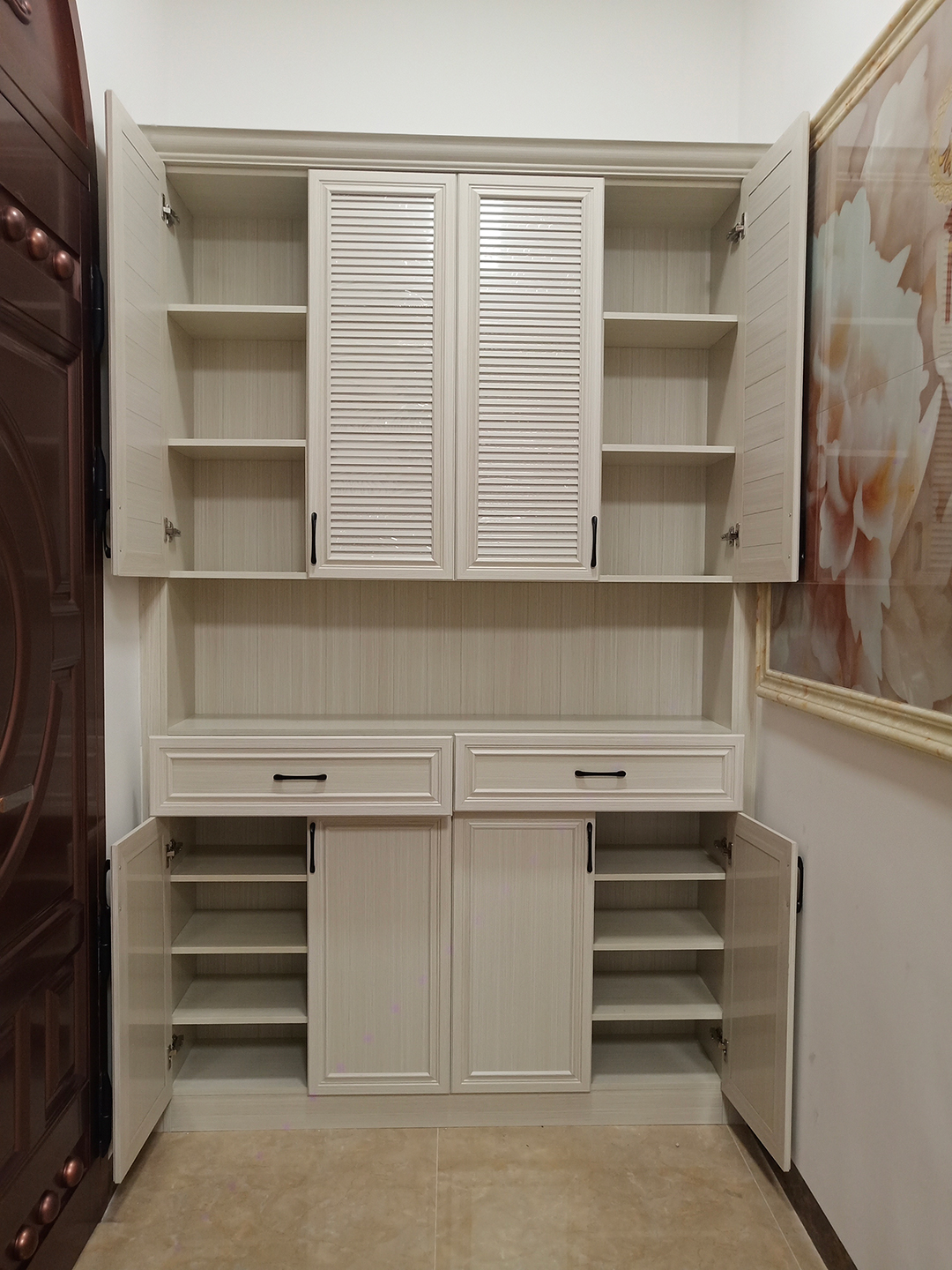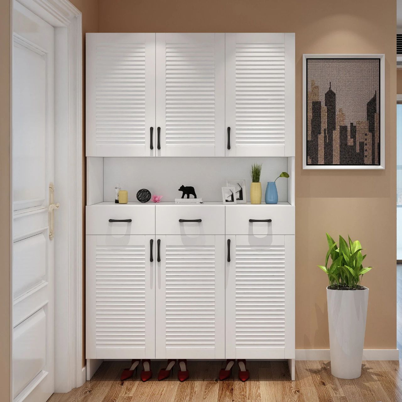 只能說百葉柜門有利有弊,好處就是空氣能夠流通,鞋子不容易發(fā)霉;壞處就是,鞋子里面的臭味容易散發(fā)出來,所以裝不裝百葉柜門,可以綜合考慮再做取舍,對(duì)于決定要裝門的,建議大家放入樟腦球。