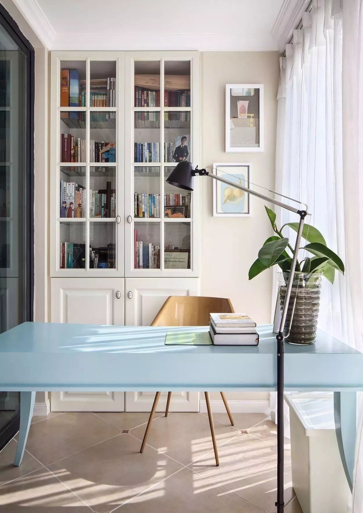 將陽臺(tái)改造成陽光書房。利用良好的采光,配以白色木紋家具,用藍(lán)色書桌點(diǎn)綴,干凈清雅。對面則搭配綠色植物,巧妙將自然搬進(jìn)工作臺(tái)旁,試想下回復(fù)郵件的同時(shí)還能經(jīng)歷花開花謝,工作都變得有愛。