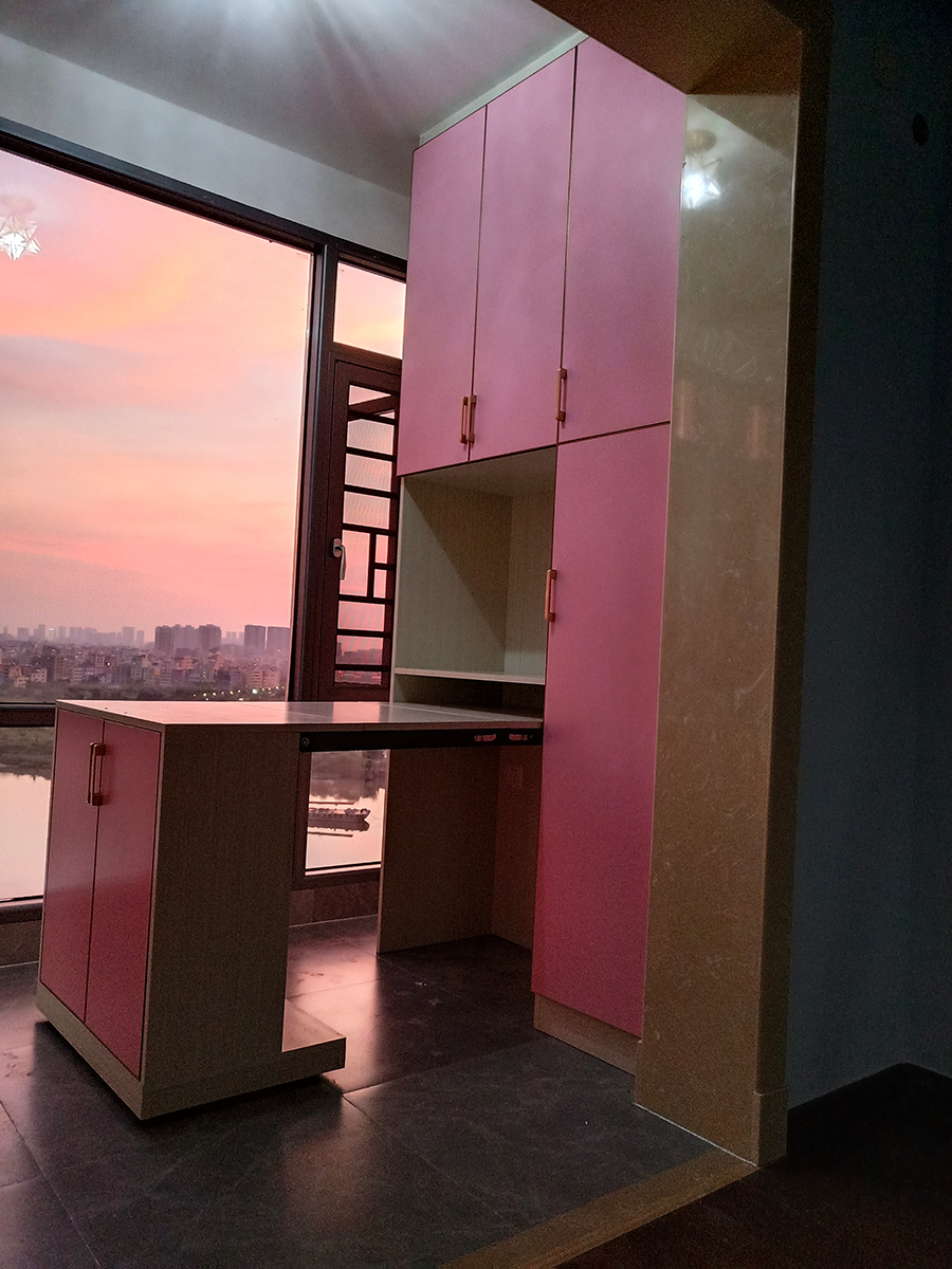 如果不想墨守成規(guī),可以將陽臺(tái)的隔斷完全打掉,改成了榻榻米休閑區(qū),閑暇時(shí)坐在上面喝喝茶放松放松,特別愜意。地臺(tái)柜子還兼具了收納功能。至于晾衣服的話,在窗外裝了一個(gè)收縮晾衣架,晾衣服就沒問題了。
