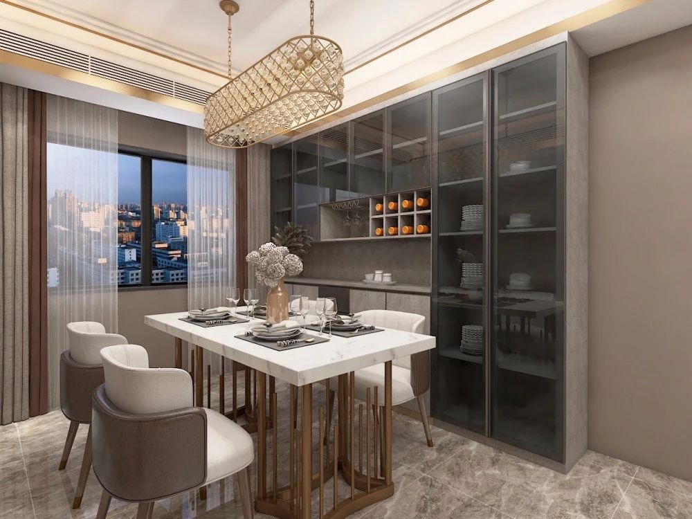 嵌入式餐邊柜多為上下柜體,中間鏤空的樣式。選擇嵌入式,美觀齊整,可以節(jié)省餐廳空間,不同樣式的餐邊柜還能美化餐廳,在提升餐廳美感的同時,增加餐廳的儲物能力。