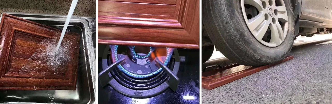 用打火機(jī)測試,顆粒復(fù)合板家居明顯的灼燒痕跡,木紋鋁板家居沒有絲毫灼燒痕跡,木紋鋁板家居完全不怕明火的傷害。