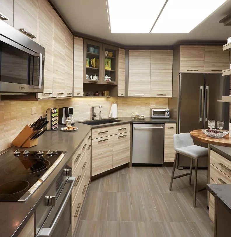 U型櫥柜就是在面積比較大的戶型里會常見了,因為有2個拐角,操作臺的空間也大了,適合2-3人一起做飯,這樣家里人多做飯的效率也提高了。