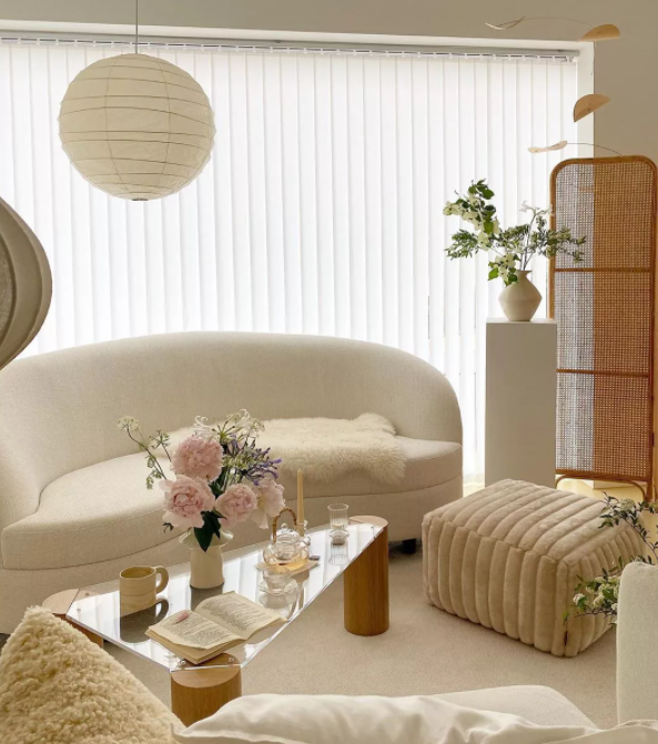 奶茶風首先是奶茶色,也就是整體的膚感裸色。它由米白色、米黃色、暖灰色,白色,以及原木色組成,輕到可以飄起來,唯一的重色就是較深的木料,或綠植的墨綠色。