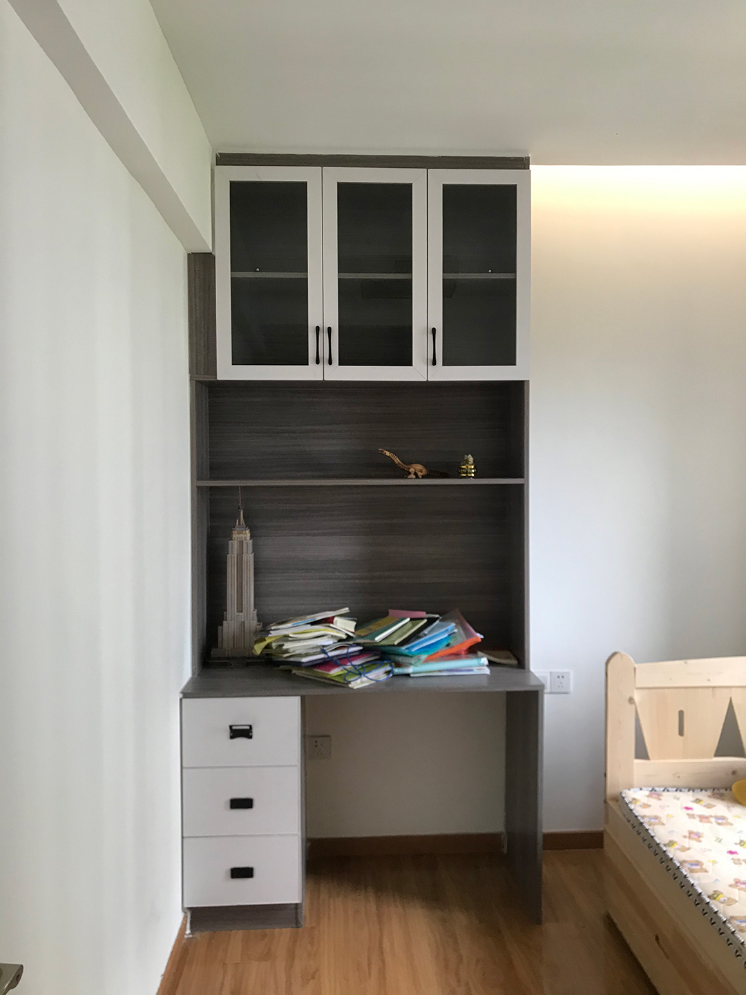 書柜+寫字臺書桌是學(xué)齡期兒童房必備,書桌上方可以做上隔板或吊柜,增添儲物能力,書桌的一邊加上柜子。書桌上方的吊柜,可以選擇用玻璃柜門,既可以避免落灰的問題,想要拿東西的時候,也更容易找到。
