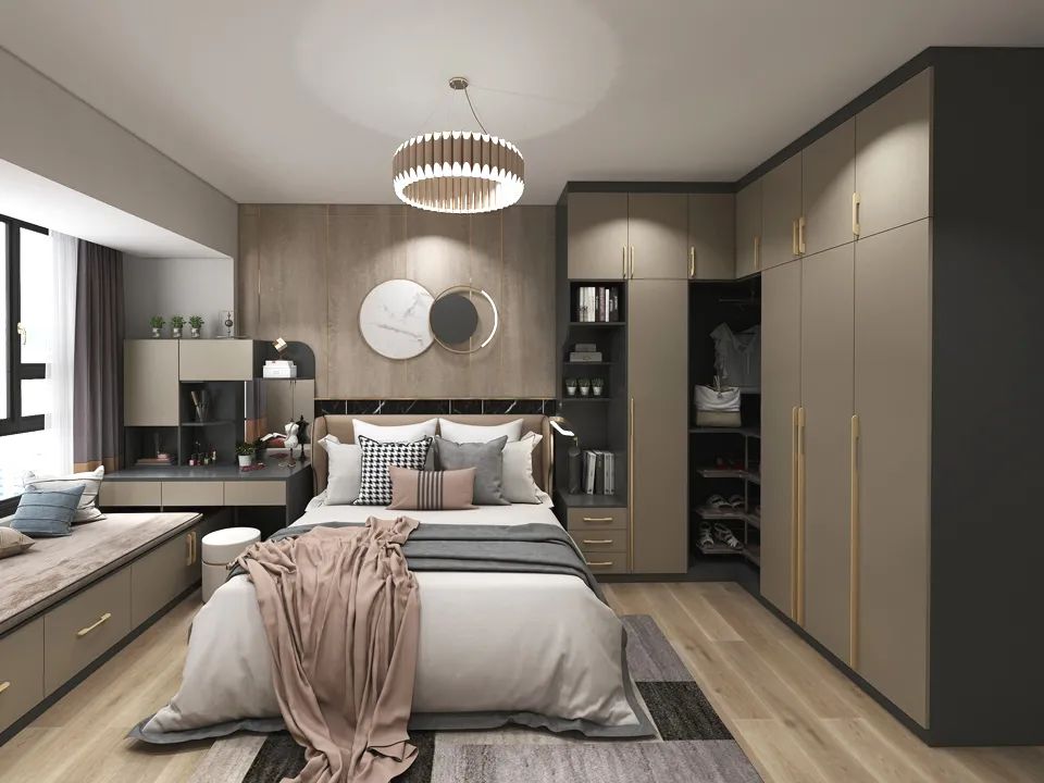 將床頭一側(cè)和梳妝臺功能結(jié)合起來,更加符合已婚家庭的臥室生活動線,一邊轉(zhuǎn)角衣柜留一邊開放格做床頭柜空間利用最大化,互不打擾。