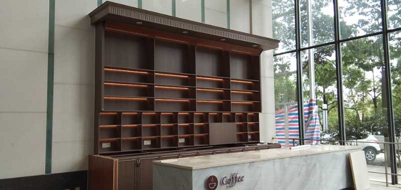 柜體的上方是咖啡品種展示柜,柜體的下方是帶柜門的收納柜,后期還會裝石英石操作臺,整個柜體防水防火防蟲蛀,結(jié)實耐用。