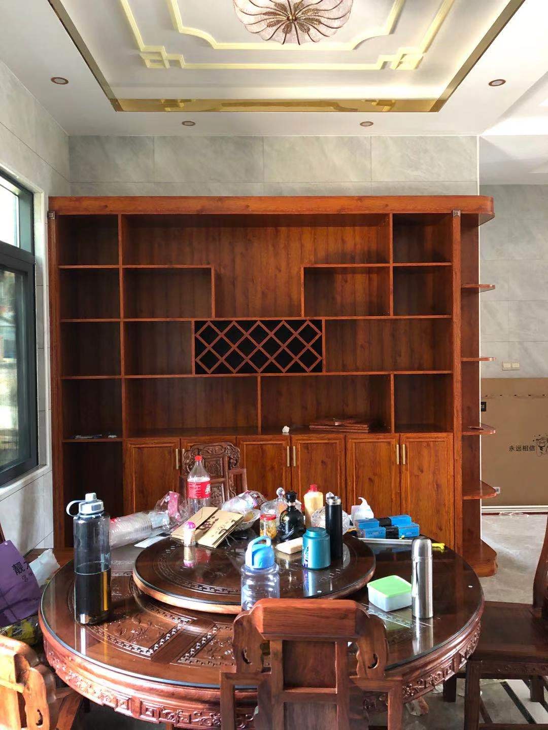 1樓是客餐廳,這是1樓的餐邊酒柜,掩門柜+開放格+酒格,功能齊全,方便儲物。自建房由于面積比較大,墻面大都是大白墻或者淺色系瓷磚墻面,業(yè)主偏愛中式紅木紋家具,所以主色選的是黃花梨,小孩房間的家具迎合孩子們的喜好選的是北歐書香桐。