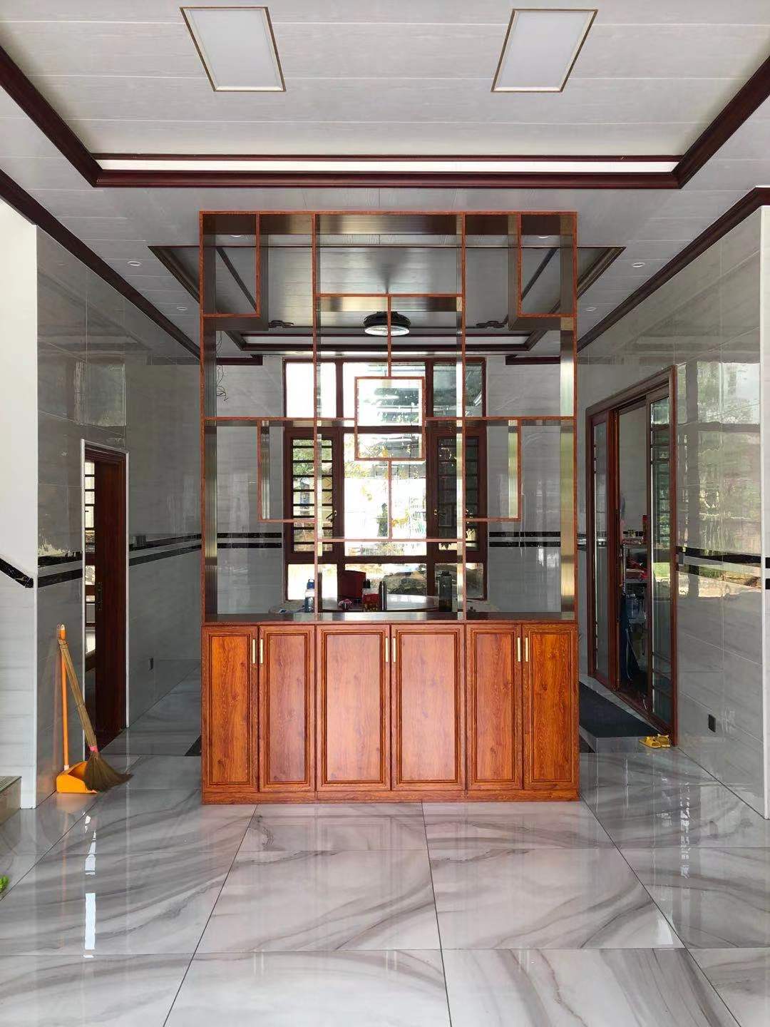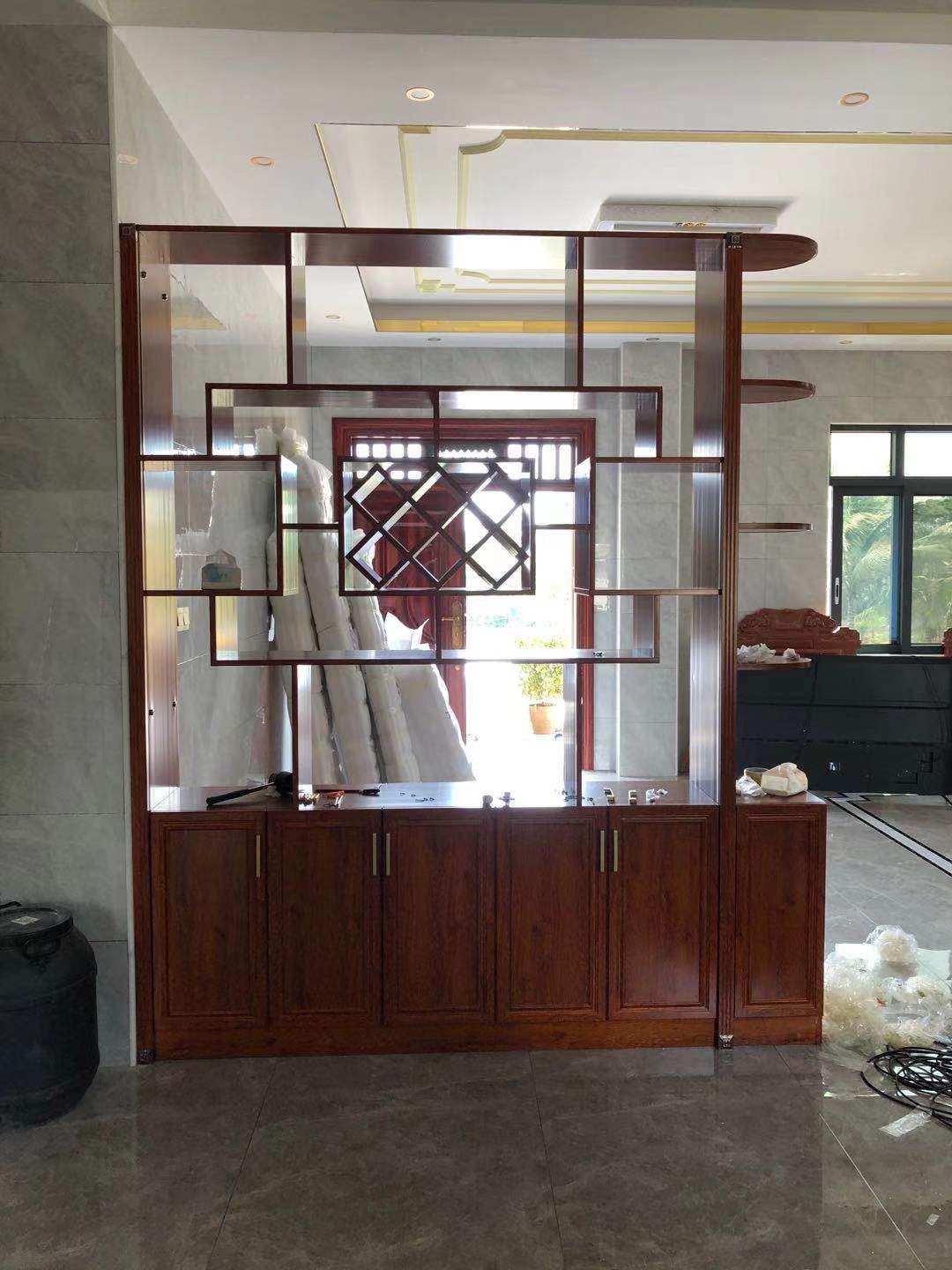 這是2樓的屏風設在大廳中間,到頂設計,上下都打了拉爆固定,與1樓同色,也是起隔斷作用。