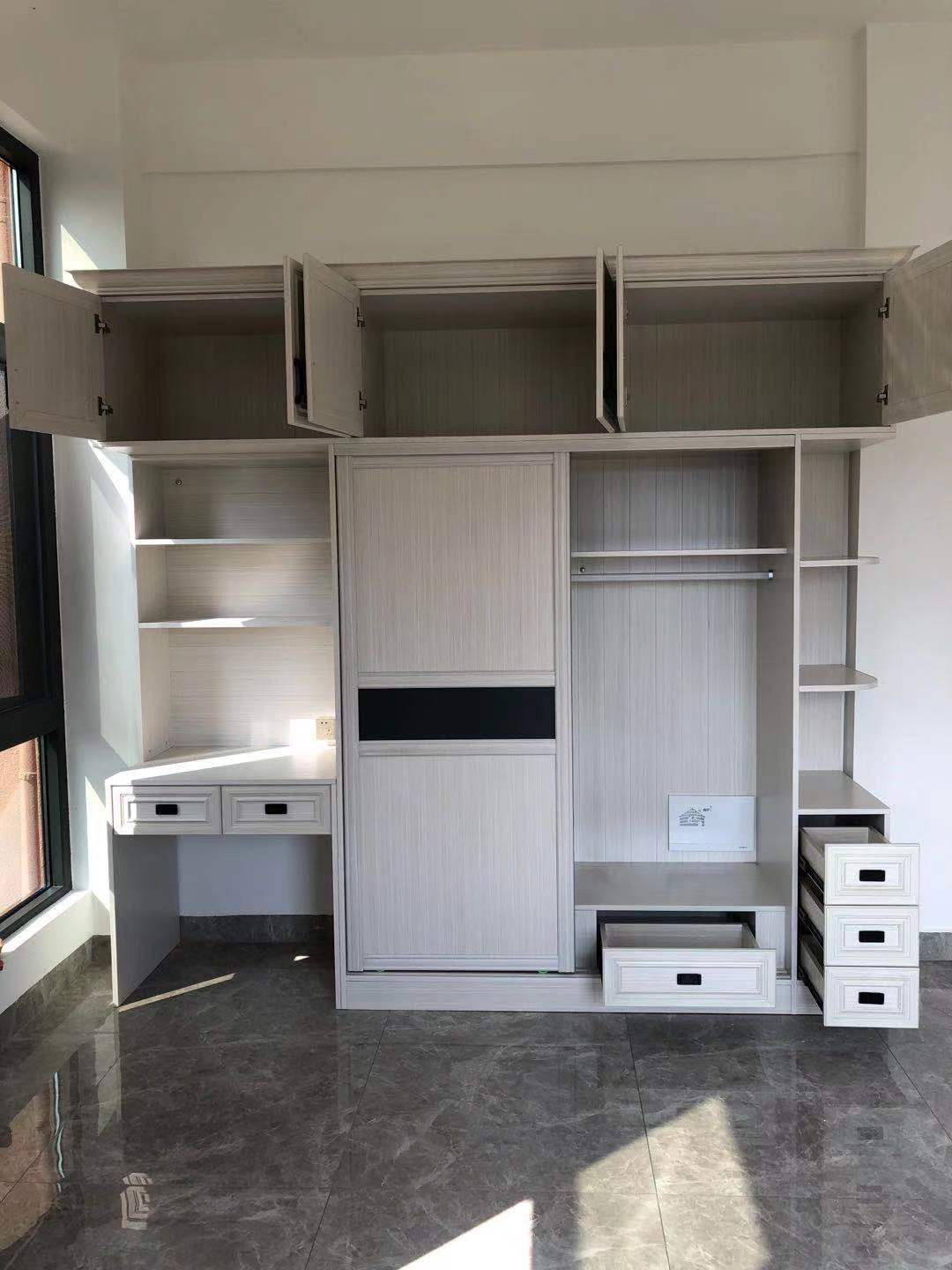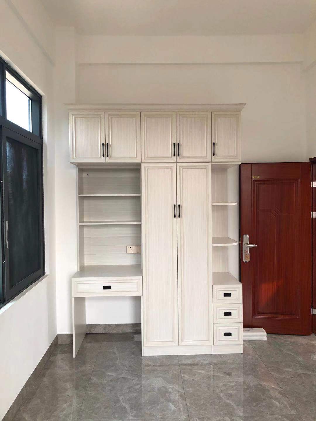 這是3樓女兒房掩門衣柜,與兒子房衣柜同一色系,也是衣柜+書桌組合,一邊半圓弧開放格+抽屜,實用。