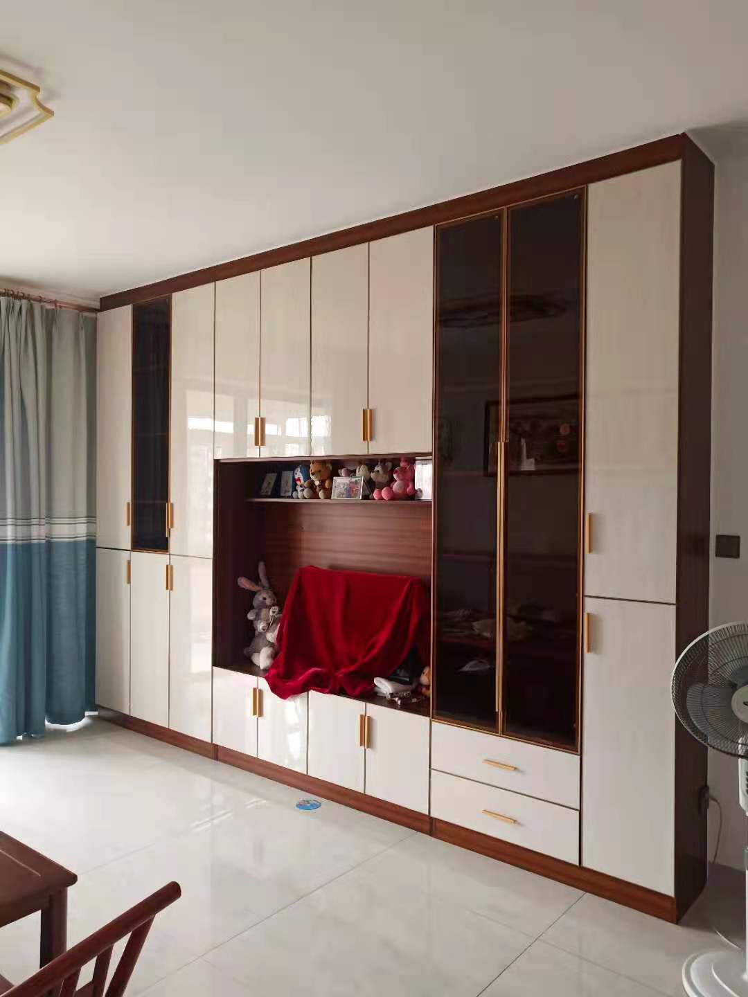 客廳做了一個超大全鋁電視柜,柜體也是全鋁焊接整板北歐柚木,門板是白色條紋高光門板+茶色玻璃門,把電視內(nèi)嵌到電視柜里,用金色邊框和金色拉手做點(diǎn)綴,盡顯輕奢質(zhì)感,業(yè)主家的兩個女兒特別喜歡公仔和玩偶,客廳的電視柜可以收納兩姐妹的各種玩具和書籍。