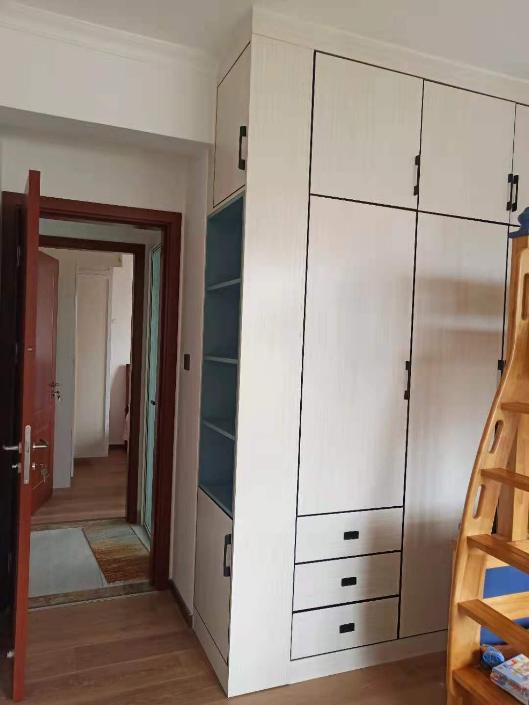 大女兒房做了一個轉(zhuǎn)角衣柜,柜體是焊接整板北歐書香桐,門板是用北歐書香桐蜂窩板做的衣柜門和抽屜門更輕便。靠門的一邊做了一個整板肌膚藍(lán)內(nèi)嵌開放格做跳色,白色系柜體搭配黑色極簡邊框門板,線條感十足。
