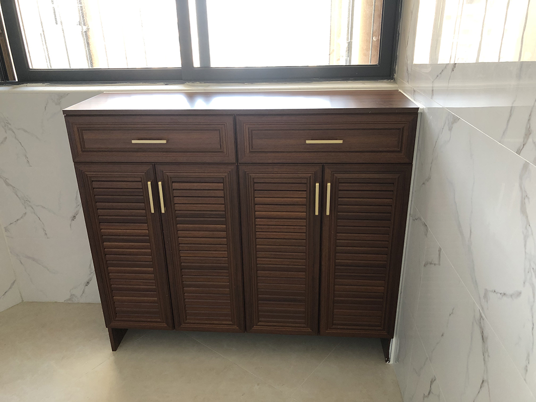 在客餐廳拐角處設(shè)計(jì)一個(gè)與窗齊平的簡(jiǎn)易全鋁鞋柜增加全家人的鞋子收納,柜體和門板都是北歐柚木,真百葉門板設(shè)計(jì),透氣佳!