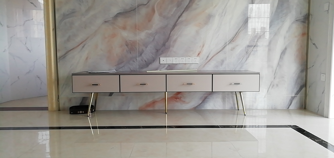 客廳做了個(gè)全鋁電視矮柜,膚感卡其門板搭配金色細(xì)腳底座盡顯輕奢質(zhì)感。