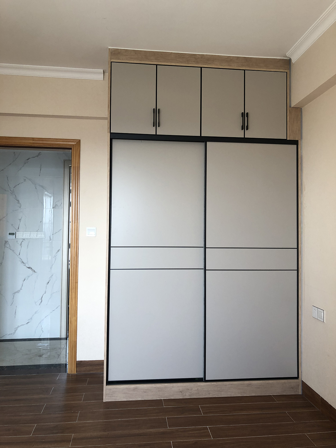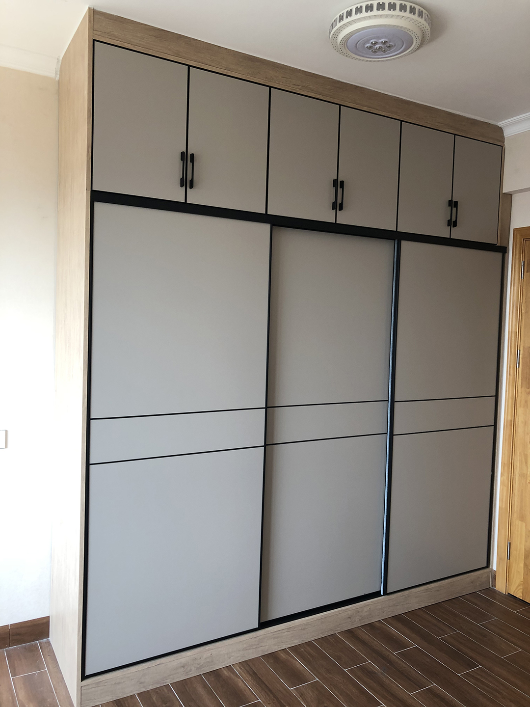 兒子房衣柜采用掩門設(shè)計(jì),柜體是焊接整板北歐松木灰,門板與整屋相呼應(yīng),膚感卡其門板搭配一字型黑色長(zhǎng)拉手,簡(jiǎn)約又時(shí)尚!