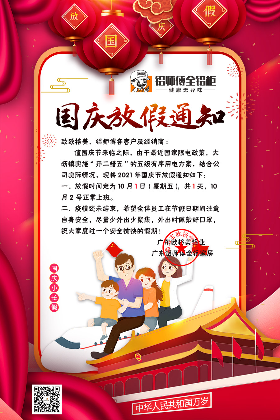 、鋁師傅全鋁家居公司實(shí)際情況,現(xiàn)將2021年國(guó)慶節(jié)放假通知如下: