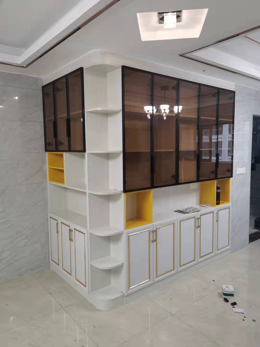 整個柜體用焊接整板北歐書香桐,門板用70框金邊門+茶色玻璃門,增加層次感。地柜做成封閉式放鞋,中間鏤空隨手放鑰匙包包,上柜做茶色玻璃門不落灰且拿取方便,中間檸檬黃開放式套格做點綴,轉(zhuǎn)角的地方做成弧形開放格避免磕磕碰碰又大方美觀,整個柜體根據(jù)生活習(xí)慣劃分功能區(qū),使用起來更加得心應(yīng)手。