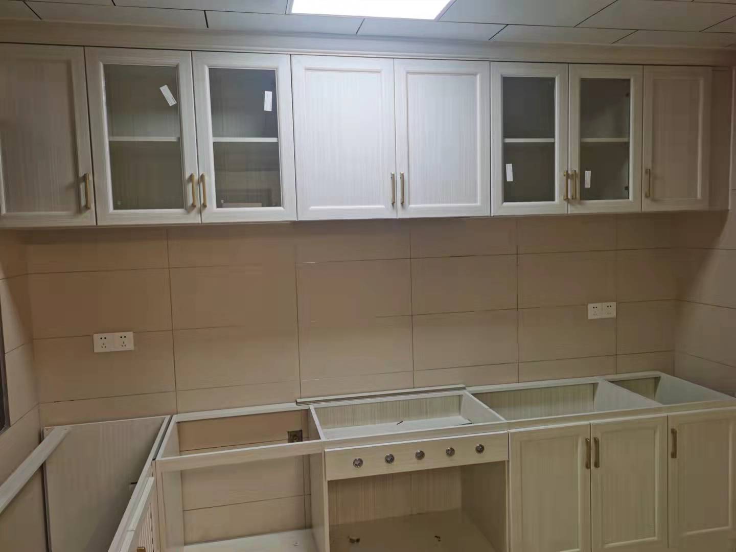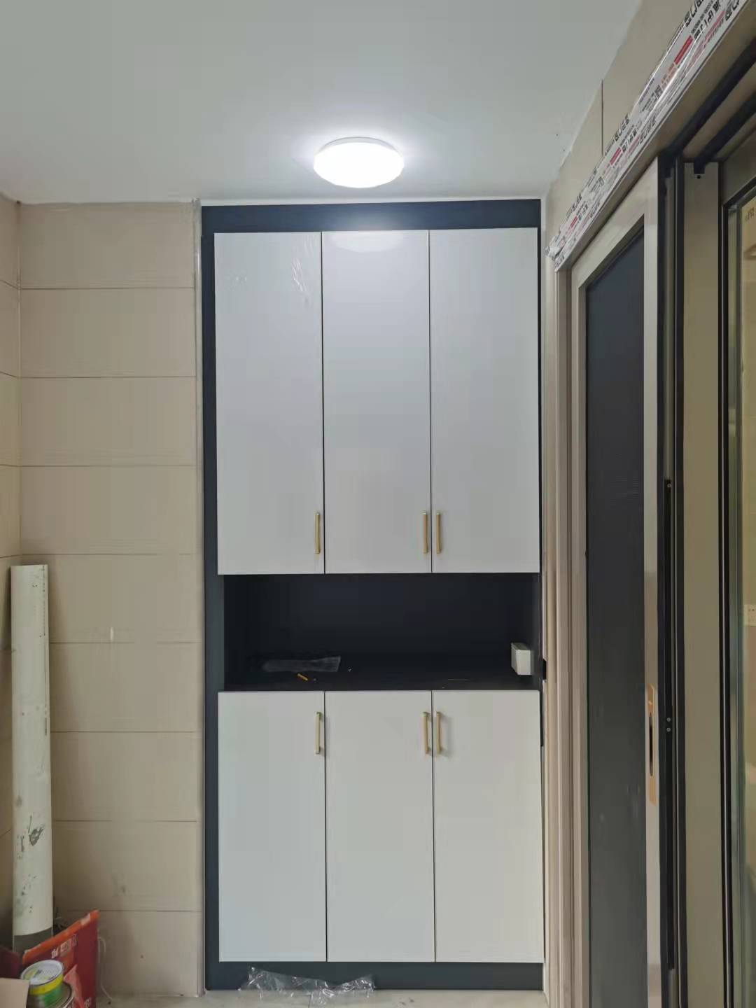 櫥柜顏色與玄關(guān)相呼應(yīng)都是焊接整板北歐書香桐,到頂?shù)豕裨黾邮占{且清潔方便,封閉門與玻璃門結(jié)合整體不壓抑。