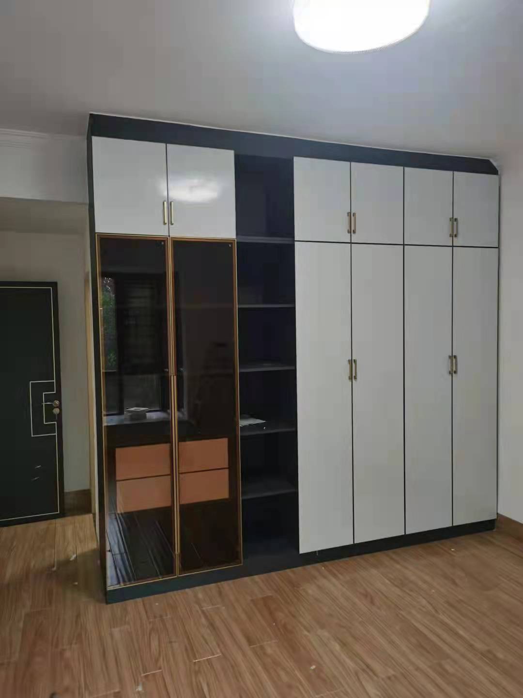 主臥衣柜柜體是焊接整板星空灰搭配極簡高光水晶白門板和金色框玻璃門,輕奢典雅,彰顯生活品味!中間一排開放格層板,虛實結(jié)合不沉悶。