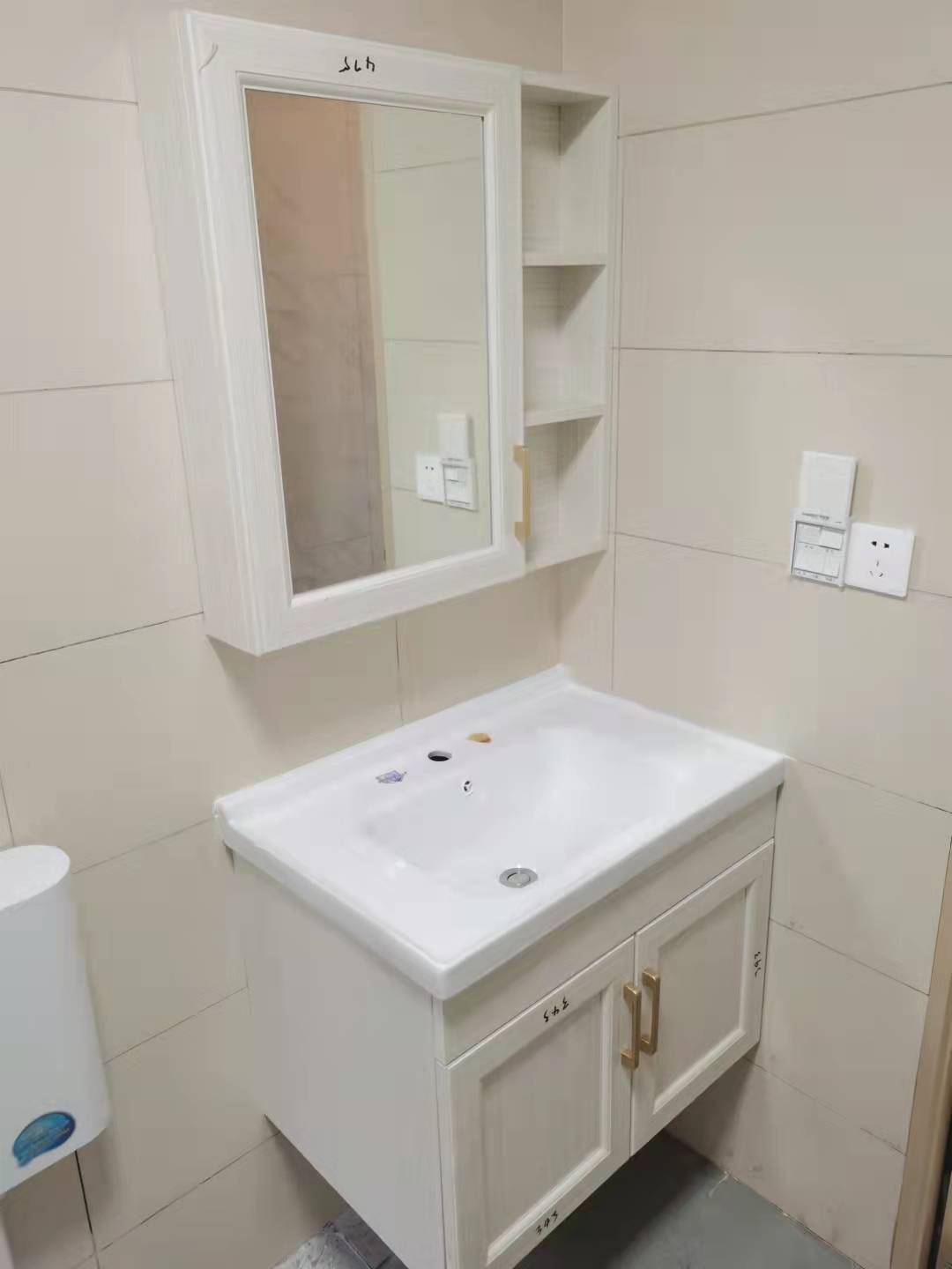 衛(wèi)浴間做壁掛式浴室柜,吊柜+鏡柜組合增加收納,柜體和門板都是北歐書香桐,金色拉手點綴,非常有質(zhì)感。