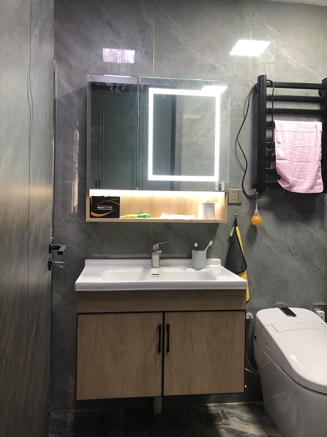 全鋁壁掛式浴室柜,好搞衛(wèi)生,簡單大方,鏡柜裝了智能燈帶,顏值瞬間提升好幾個檔次。