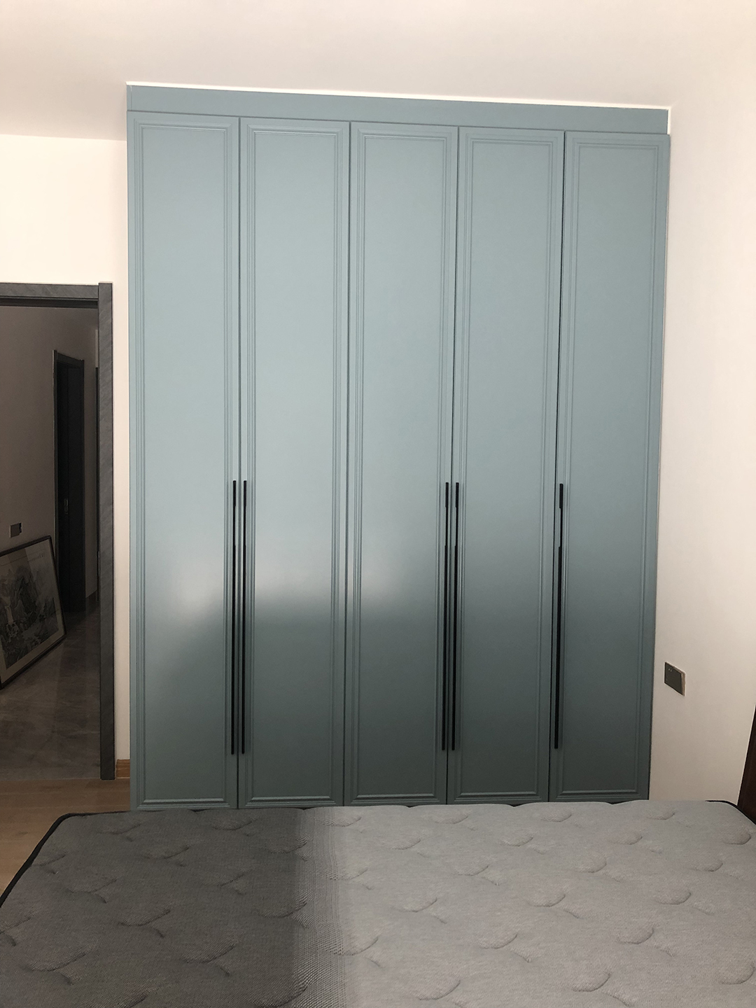 主臥入戶做了一個轉(zhuǎn)角衣帽間,更具隱私,柜體和門板都是肌膚藍,60框門板搭配一字型黑色拉手,高端大氣,一邊中間挖空設計,整體不壓抑。