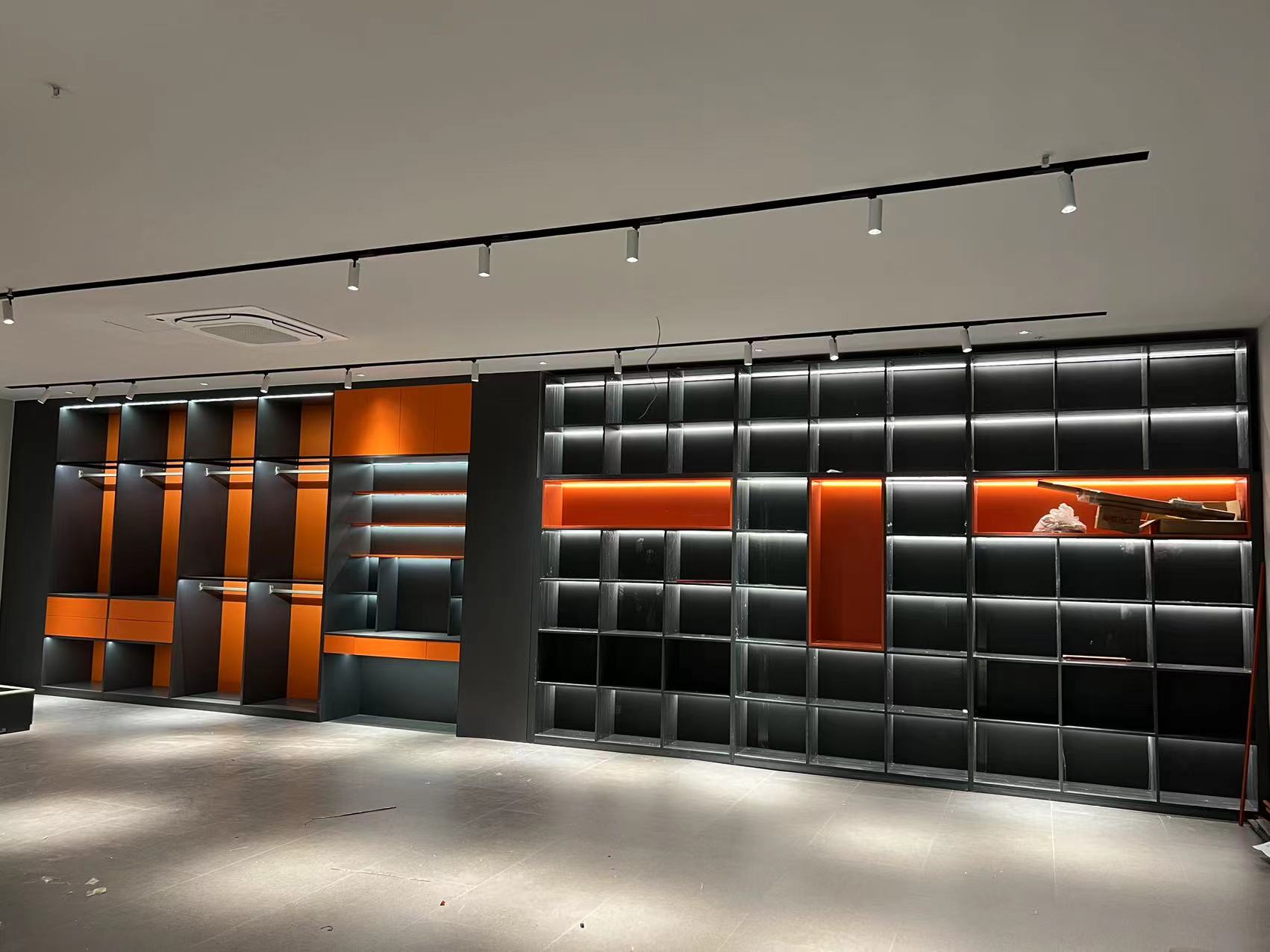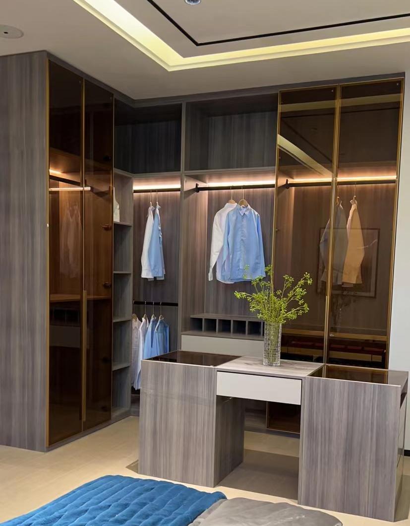 這個客戶定制的是輕奢風格,衣帽間色彩搭配是亮色系,一進屋抬眼看時眼前一亮,柜體主題色用的是北歐榆木和愛馬仕橙,加上燈帶后,氛圍感拉滿。中間是白色門板,裝上茶玻的柜體,頗有寧靜致遠的風格,低調(diào)輕奢。整體并不會覺得因為顏色多而產(chǎn)生視覺亂的感覺。