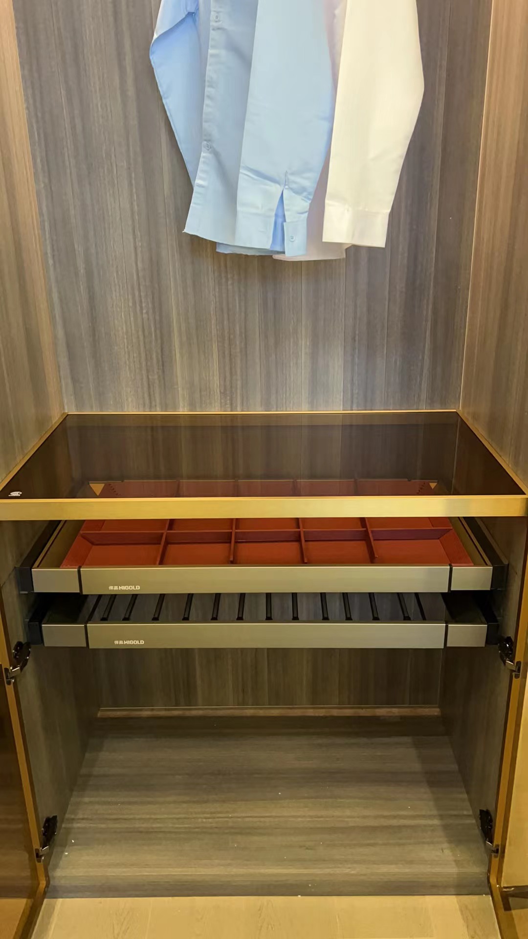 衣服下方的小柜體設計了置物層,第一層放隨手物,第二層收納小飾品,第三層是褲架,取拿不易褶皺。