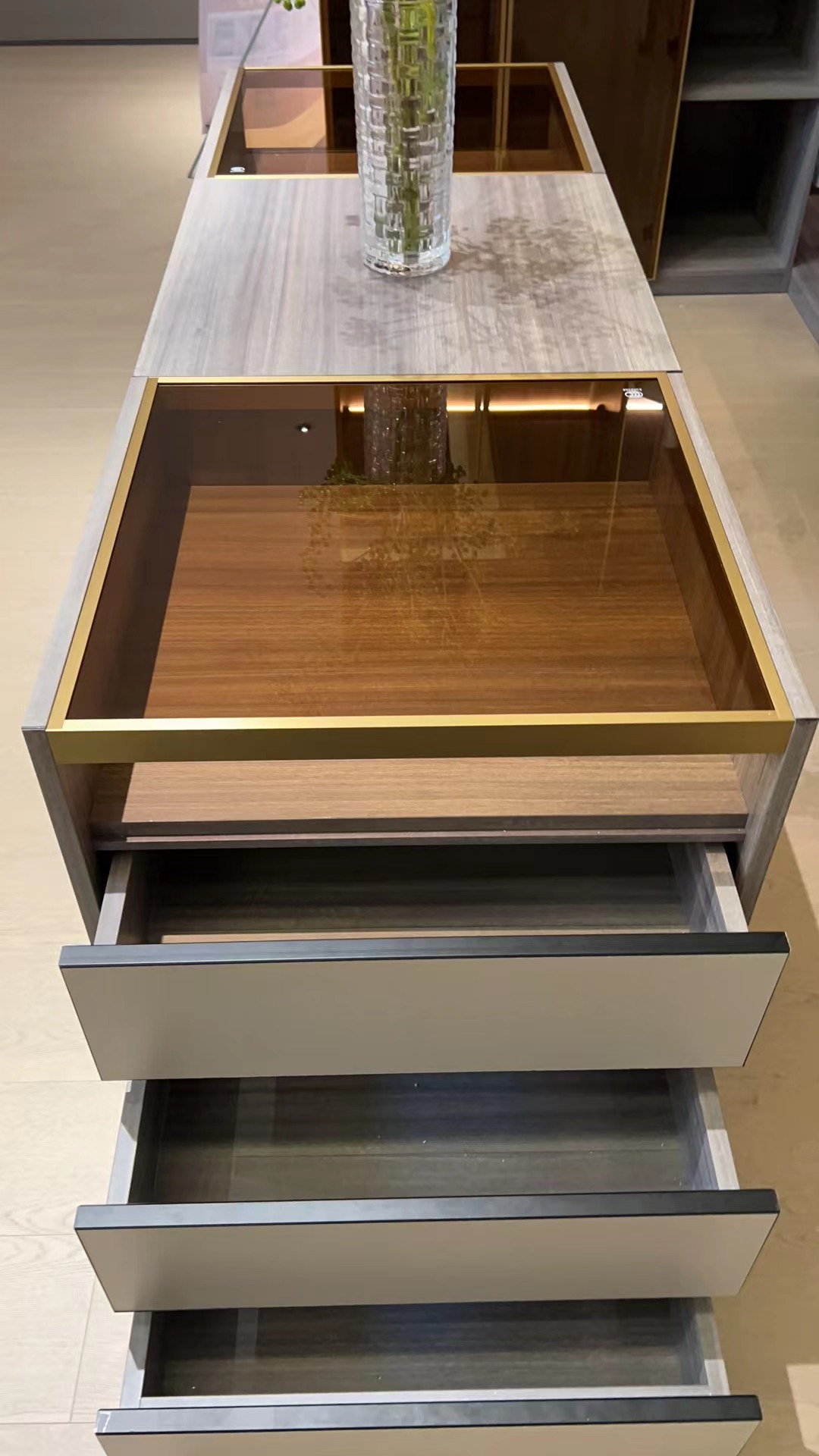 中間放花的首飾柜是用玻璃層板制作的,上面是玻璃面,側邊是抽屜門,方便隨時找到喜歡的首飾,除收納展示外也是顏值擔當。