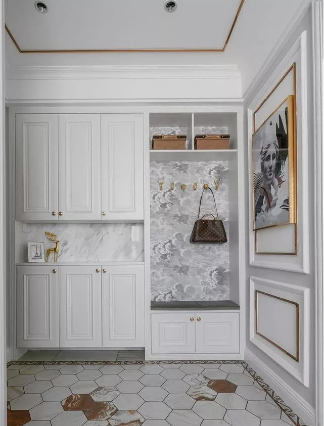 玄關(guān)空間要充分利用起來,鞋柜不要半截,建議做到頂,這樣就把上方空間都利用起來了,等你真正入住,就知道家里東西多了,多點儲物空間是好事。