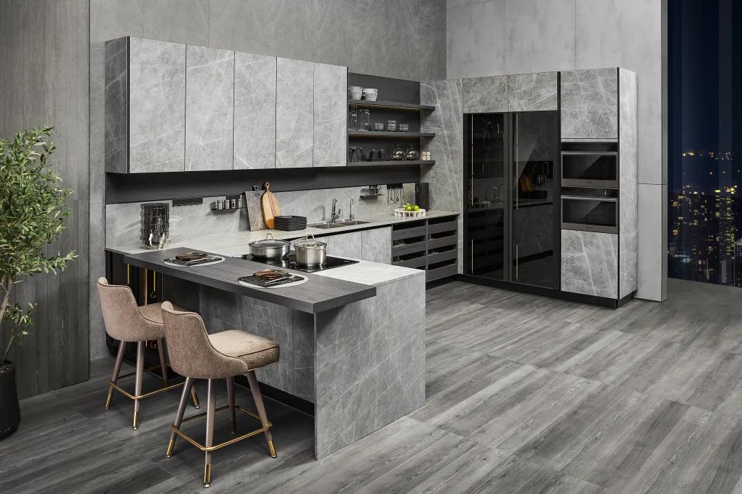 還有在“高定”中風頭無兩的巖板,由于可以做到3mm厚度的工藝突破,近來被大量應用在定制家具的飾面中,甚至還推出了“全巖板”家具。巖板的“大薄輕”以及紋理色澤的可塑性、性能的環(huán)保性,都讓其在高端定制中靈活應用,彰顯多元的設計表達。